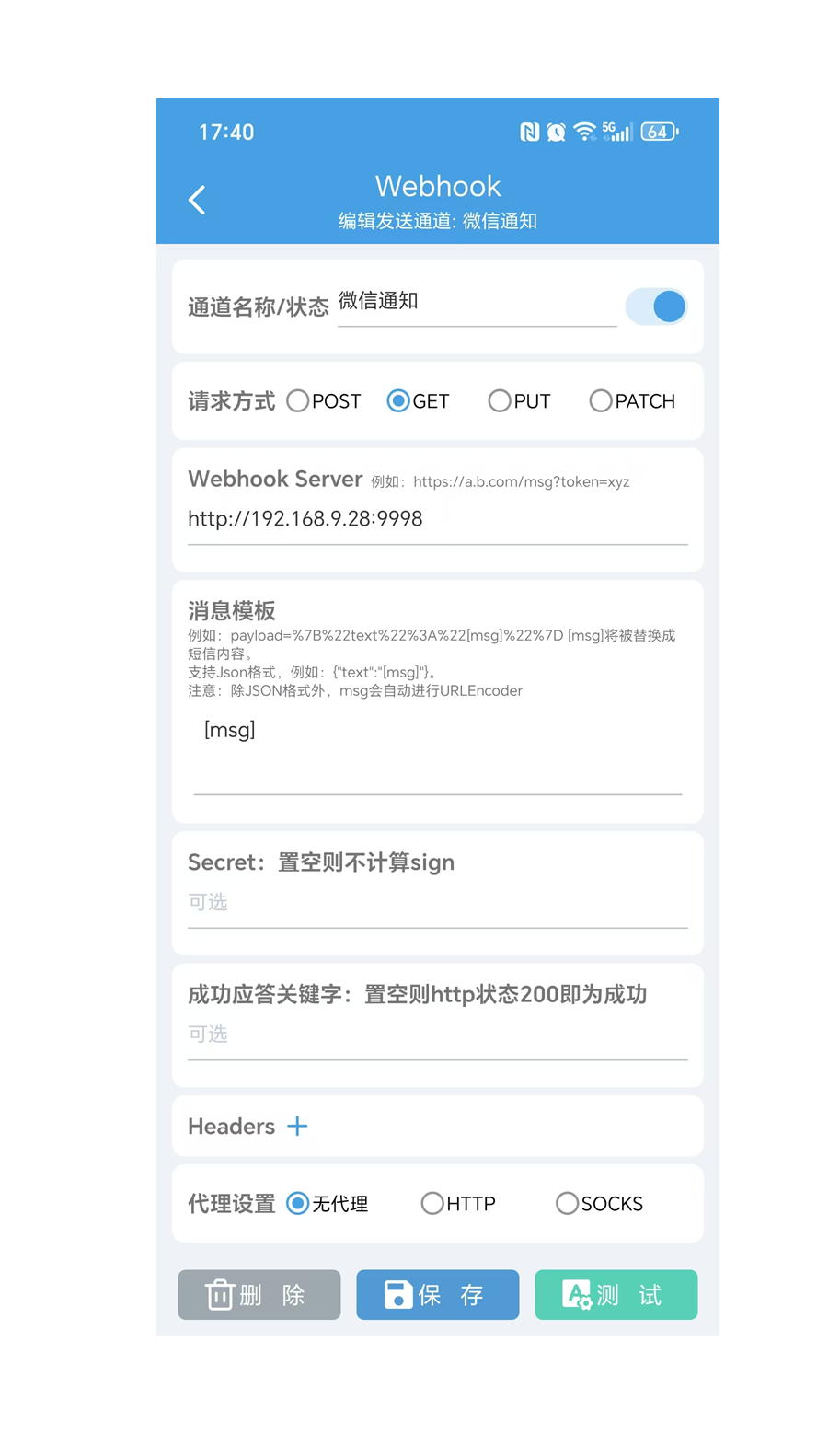 在发送通道里新建通道(类型选Webhook)。