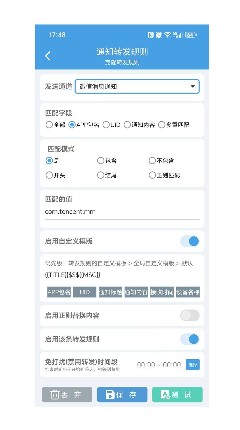 在转发规则-应用里新建转发规则,如下配置。配置后可以点击测试是否可以发送通知(此时不要有微信窗口在任务栏),然后保存。