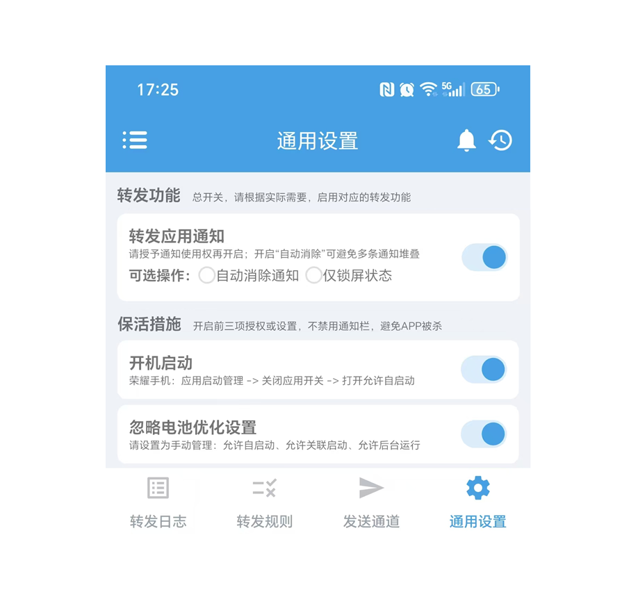 - 在通用设置里开启 转发应用通知 、 开机启动 、 忽略电池优化设置。